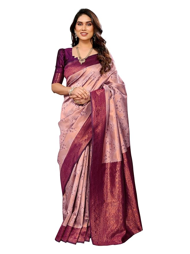 woman dressed in a graceful and elegant traditional Indian saree. The saree is crafted in a luxurious silk fabric, radiating a subtle sheen that enhances its richness. Its primary color is a soft pastel pink, beautifully complemented with delicate floral and paisley-inspired motifs woven across the body of the saree. These motifs are subtle yet intricate, giving the drape a refined charm without overwhelming the design.