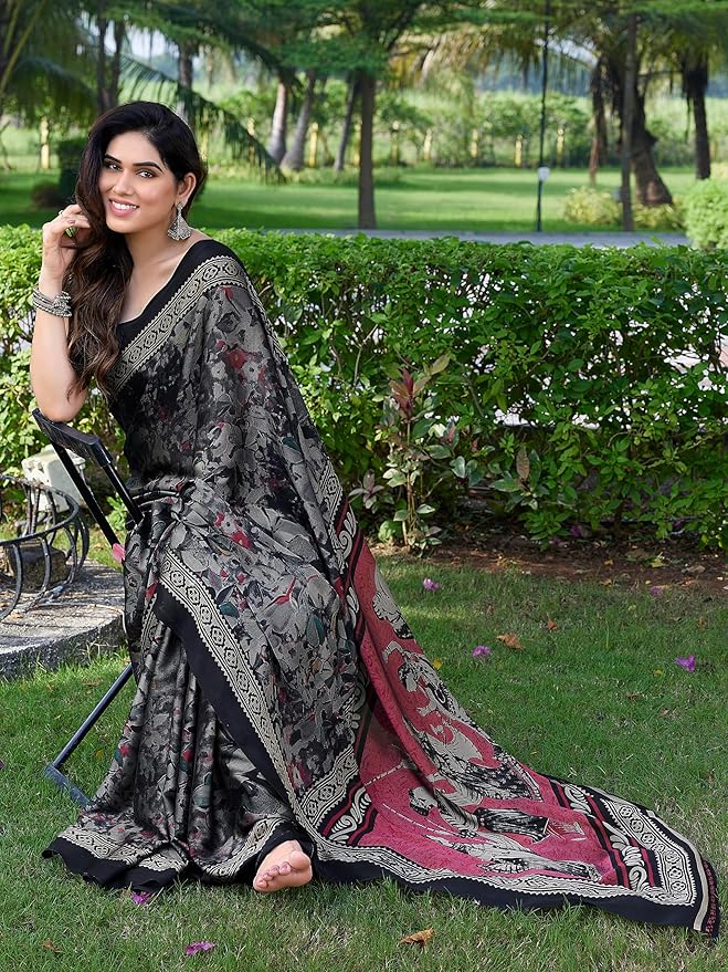 Paired with a matching black blouse piece, this saree completes a sophisticated and cohesive ensemble. Accessorize with statement silver or oxidized jewelry and a sleek hairstyle for a look that exudes confidence and charm. chiffon material saree