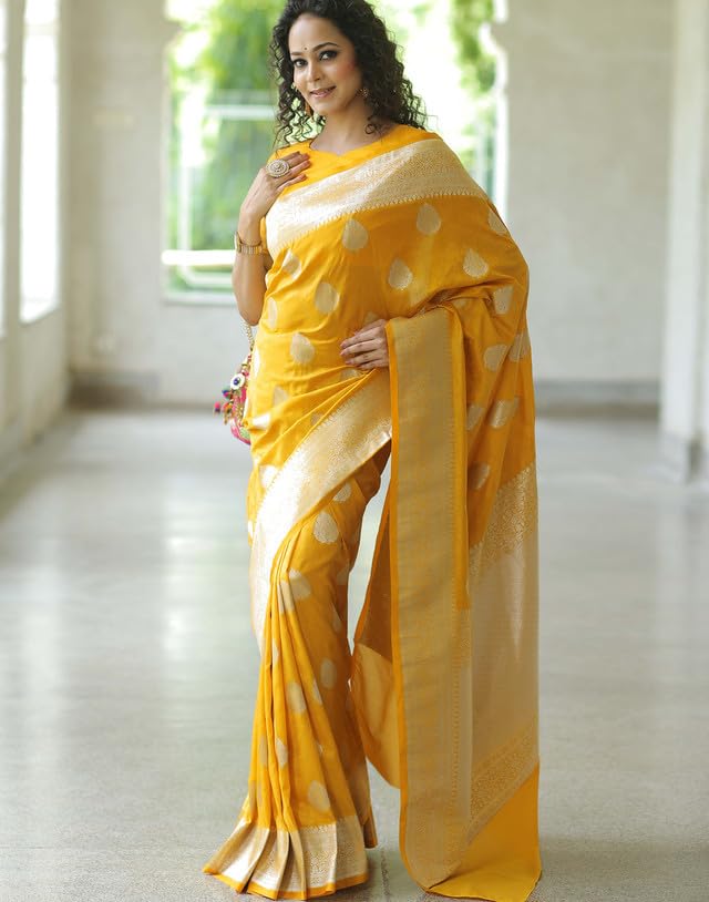 • Saree Details : Saree Fabric: Silk | Blouse Fabric: Silk | Saree Work: Weaving | Blouse Work: Weaving Border | Saree Color: Yellow | Blouse Color: Yellow
