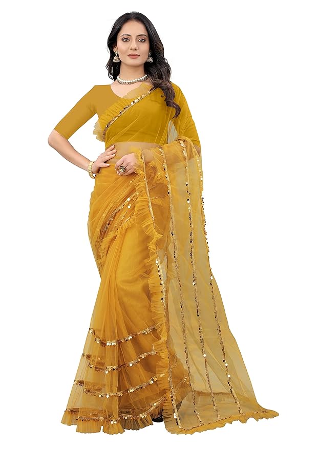 Brighten your festive look with this stunning yellow net saree, richly embroidered and enhanced with frill and sequin lace. Paired with an unstitched Banglori silk blouse piece, it offers elegance and comfort for weddings, parties, and celebrations. Lightweight and made in India, perfect for traditional occasions.