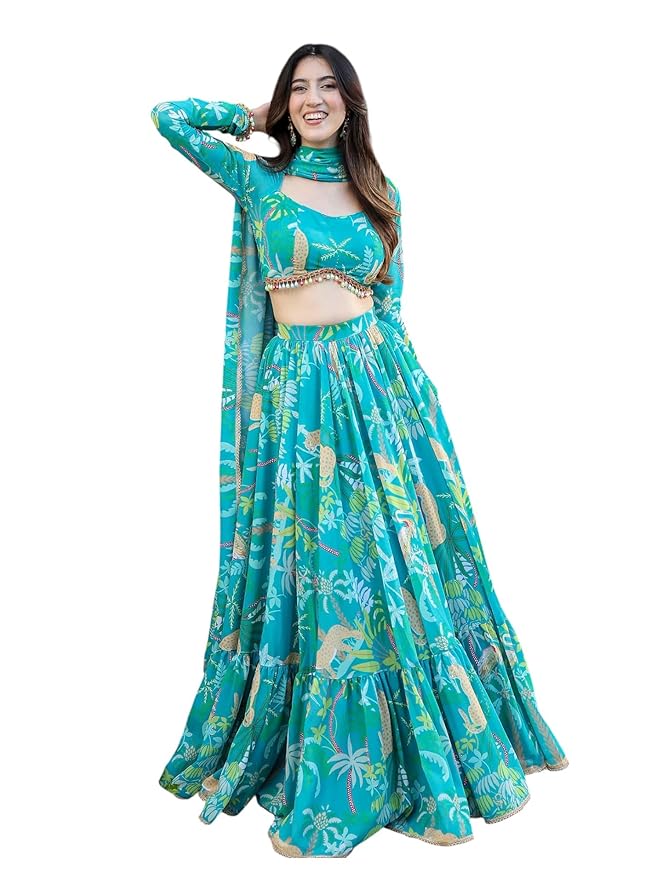 This turquoise botanical printed lehenga choli ensemble is a fresh and vibrant take on traditional Indian ethnic wear. Its combination of lightweight, breathable fabric, lively tropical prints, and modern cuts makes it a standout piece for anyone looking to blend culture with contemporary style. Perfect for festive occasions, weddings, or casual celebrations, this outfit offers both elegance and comfort, ensuring the wearer feels radiant, confident, and uniquely stylish. wedding lehenga for bride